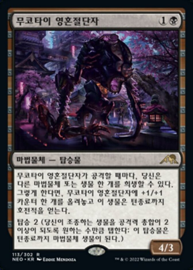 | Rules | Whenever Mukotai Soulripper attacks, you may sacrifice another artifact or creature. If you do, put a +1/+1 counter on Mukotai Soulripper and it gains menace until end of turn. Crew 2 (Tap any number of creatures you control with total power 2 or more: This Vehicle becomes an artifact creature until end of turn.) |