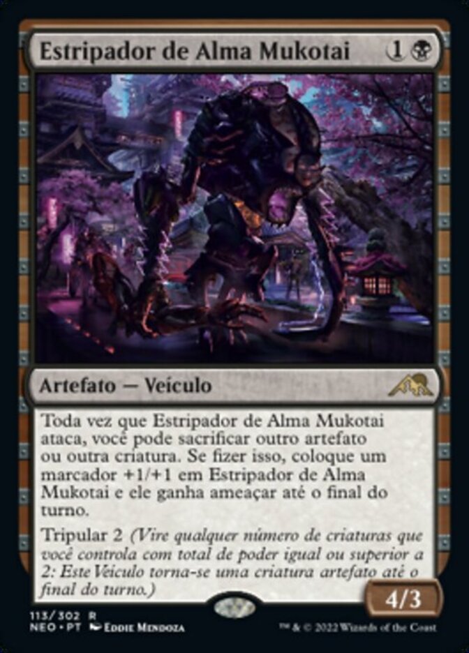 | Rules | Whenever Mukotai Soulripper attacks, you may sacrifice another artifact or creature. If you do, put a +1/+1 counter on Mukotai Soulripper and it gains menace until end of turn. Crew 2 (Tap any number of creatures you control with total power 2 or more: This Vehicle becomes an artifact creature until end of turn.) |