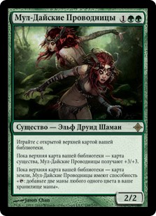 | Rules | Play with the top card of your library revealed. As long as the top card of your library is a creature card, Mul Daya Channelers gets +3/+3. As long as the top card of your library is a land card, Mul Daya Channelers has ": Add two mana of any one color." |