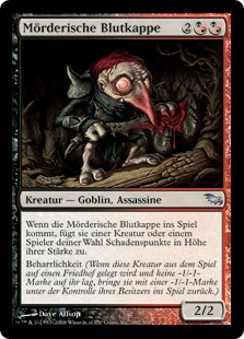 | Rules | When Murderous Redcap enters the battlefield, it deals damage equal to its power to any target. Persist (When this creature dies, if it had no -1/-1 counters on it, return it to the battlefield under its owner's control with a -1/-1 counter on it.) |