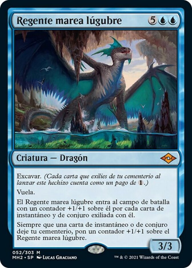 | Rules | Delve (Each card you exile from your graveyard while casting this spell pays for .) Flying Murktide Regent enters the battlefield with a +1/+1 counter on it for each instant and sorcery card exiled with it. Whenever an instant or sorcery card leaves your graveyard, put a +1/+1 counter on Murktide Regent. |
