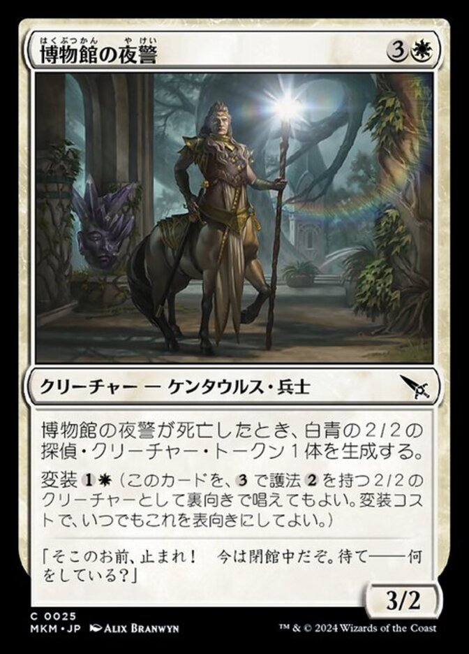 | Rules | When Museum Nightwatch dies, create a 2/2 white and blue Detective creature token. Disguise (You may cast this card face down for as a 2/2 creature with ward . Turn it face up any time for its disguise cost.) |