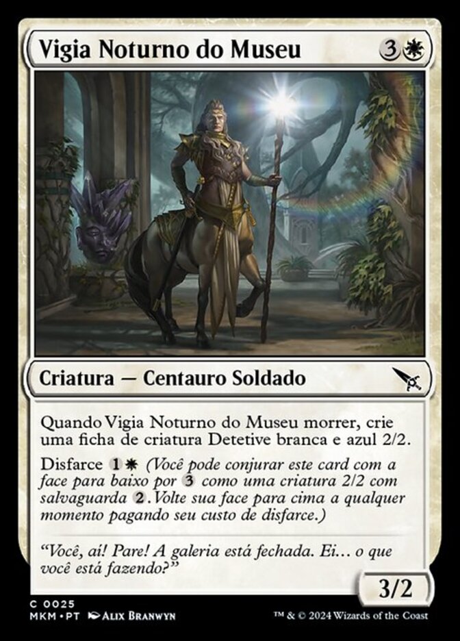| Rules | When Museum Nightwatch dies, create a 2/2 white and blue Detective creature token. Disguise (You may cast this card face down for as a 2/2 creature with ward . Turn it face up any time for its disguise cost.) |