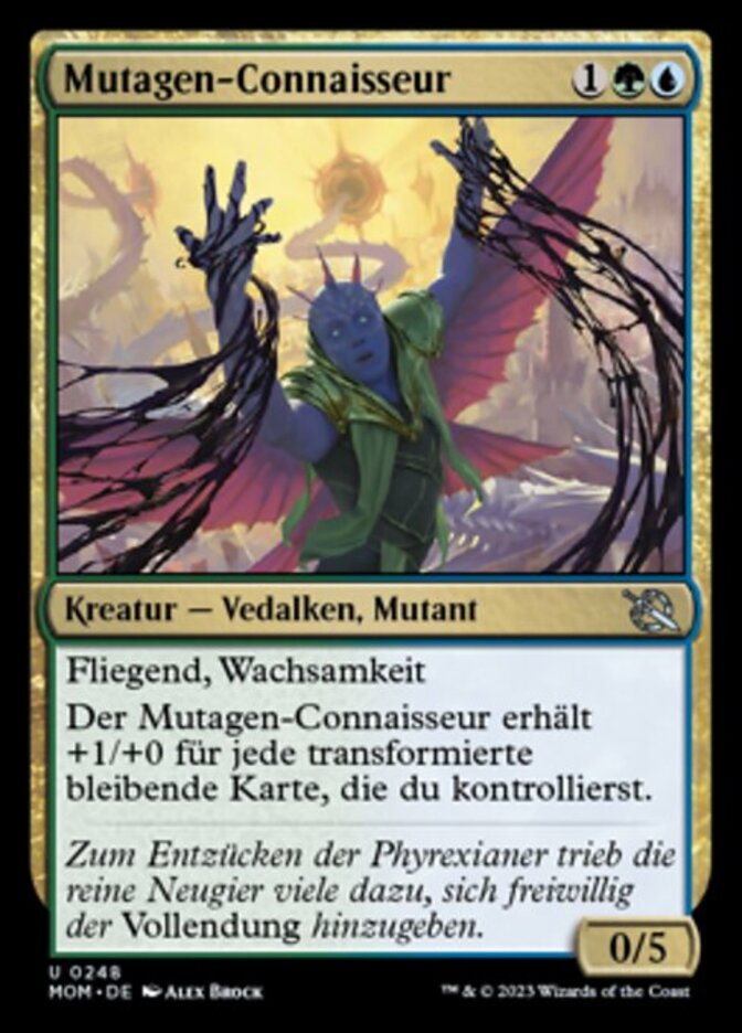 | Rules | Flying, vigilance Mutagen Connoisseur gets +1/+0 for each transformed permanent you control. |