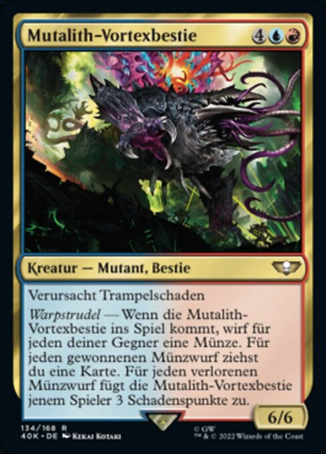| Rules | Trample Warp Vortex — When Mutalith Vortex Beast enters the battlefield, flip a coin for each opponent you have. For each flip you win, draw a card. For each flip you lose, Mutalith Vortex Beast deals 3 damage to that player. |