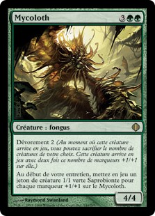 | Rules | Devour 2 (As this enters the battlefield, you may sacrifice any number of creatures. This creature enters the battlefield with twice that many +1/+1 counters on it.) At the beginning of your upkeep, create a 1/1 green Saproling creature token for each +1/+1 counter on Mycoloth. |