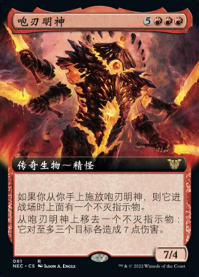 | Rules | Myojin of Roaring Blades enters the battlefield with an indestructible counter on it if you cast it from your hand. Remove an indestructible counter from Myojin of Roaring Blades: It deals 7 damage to each of up to three targets. |