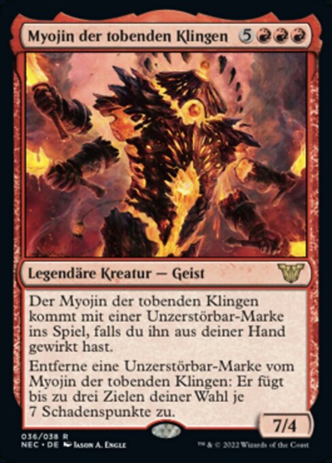 | Rules | Myojin of Roaring Blades enters the battlefield with an indestructible counter on it if you cast it from your hand. Remove an indestructible counter from Myojin of Roaring Blades: It deals 7 damage to each of up to three targets. |