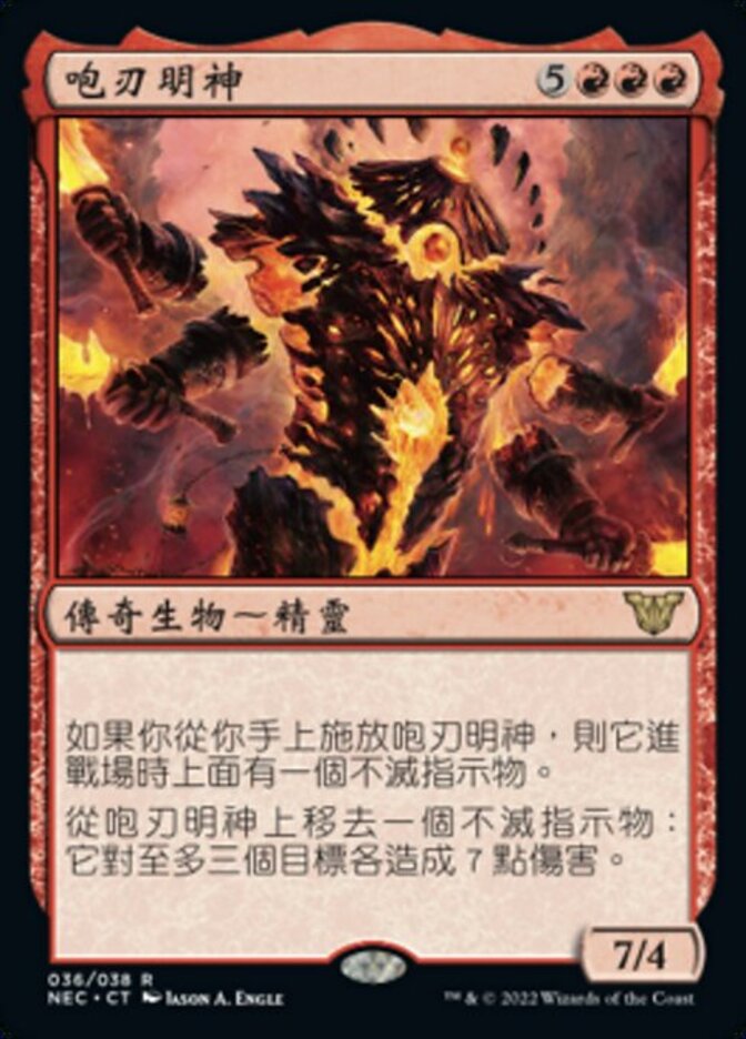 | Rules | Myojin of Roaring Blades enters the battlefield with an indestructible counter on it if you cast it from your hand. Remove an indestructible counter from Myojin of Roaring Blades: It deals 7 damage to each of up to three targets. |