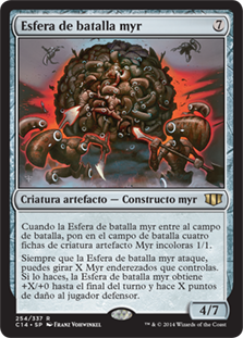 | Rules | When Myr Battlesphere enters the battlefield, create four 1/1 colorless Myr artifact creature tokens. Whenever Myr Battlesphere attacks, you may tap X untapped Myr you control. If you do, Myr Battlesphere gets +X/+0 until end of turn and deals X damage to the player or planeswalker it's attacking. |