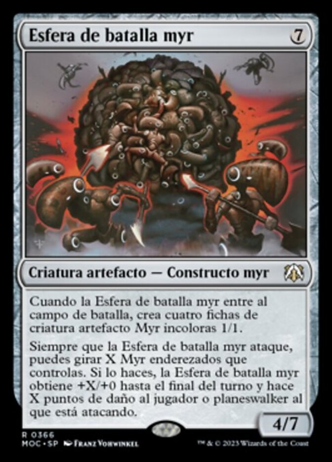 | Rules | When Myr Battlesphere enters the battlefield, create four 1/1 colorless Myr artifact creature tokens. Whenever Myr Battlesphere attacks, you may tap X untapped Myr you control. If you do, Myr Battlesphere gets +X/+0 until end of turn and deals X damage to the player or planeswalker it's attacking. |