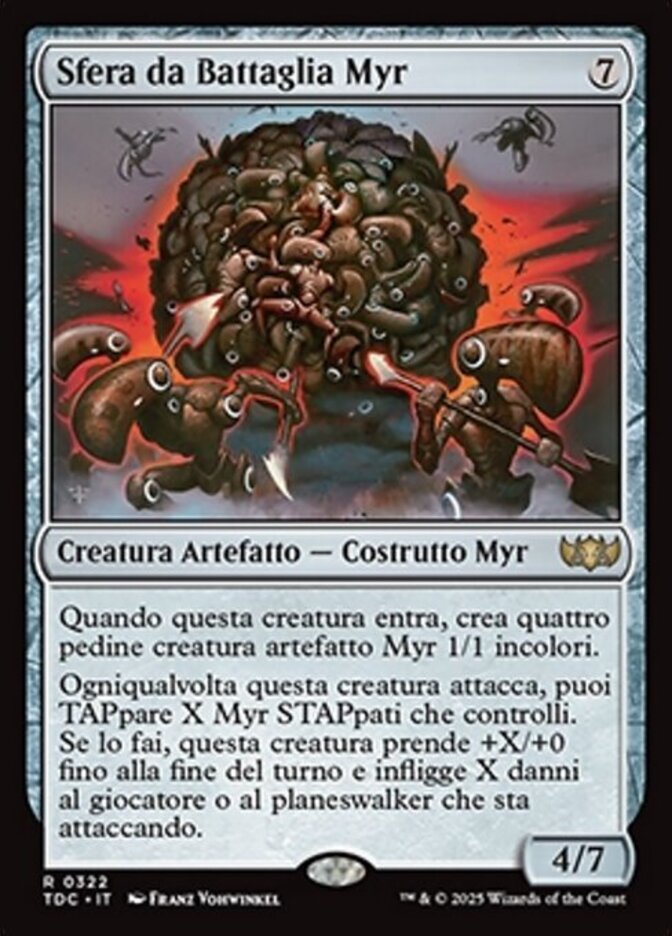 | Rules | When Myr Battlesphere enters the battlefield, create four 1/1 colorless Myr artifact creature tokens. Whenever Myr Battlesphere attacks, you may tap X untapped Myr you control. If you do, Myr Battlesphere gets +X/+0 until end of turn and deals X damage to the player or planeswalker it's attacking. |