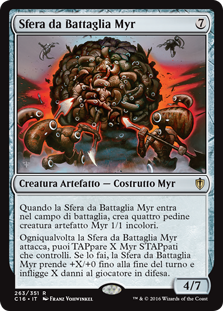 | Rules | When Myr Battlesphere enters the battlefield, create four 1/1 colorless Myr artifact creature tokens. Whenever Myr Battlesphere attacks, you may tap X untapped Myr you control. If you do, Myr Battlesphere gets +X/+0 until end of turn and deals X damage to the player or planeswalker it's attacking. |