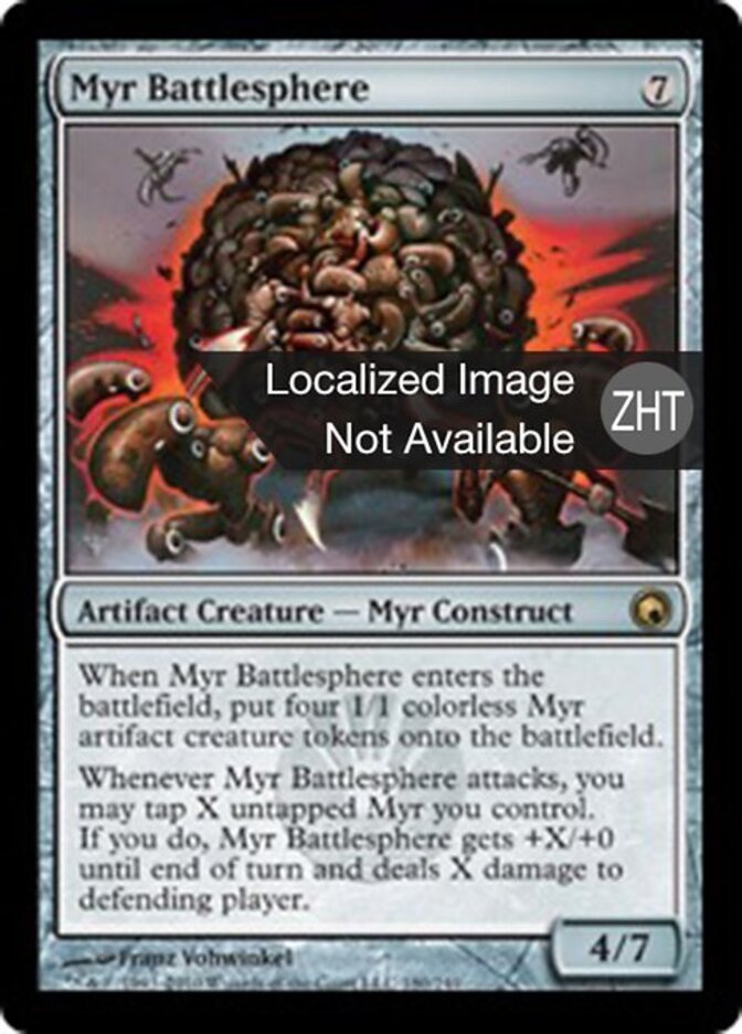 | Rules | When Myr Battlesphere enters the battlefield, create four 1/1 colorless Myr artifact creature tokens. Whenever Myr Battlesphere attacks, you may tap X untapped Myr you control. If you do, Myr Battlesphere gets +X/+0 until end of turn and deals X damage to the player or planeswalker it's attacking. |