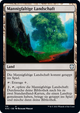 | Rules | Myriad Landscape enters the battlefield tapped. : Add . , , Sacrifice Myriad Landscape: Search your library for up to two basic land cards that share a land type, put them onto the battlefield tapped, then shuffle. |