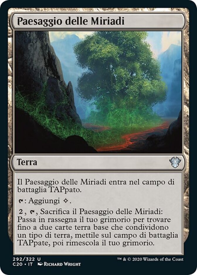 | Rules | Myriad Landscape enters the battlefield tapped. : Add . , , Sacrifice Myriad Landscape: Search your library for up to two basic land cards that share a land type, put them onto the battlefield tapped, then shuffle. |