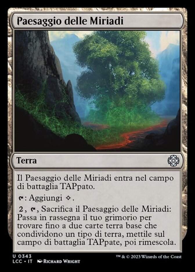 | Rules | Myriad Landscape enters the battlefield tapped. : Add . , , Sacrifice Myriad Landscape: Search your library for up to two basic land cards that share a land type, put them onto the battlefield tapped, then shuffle. |