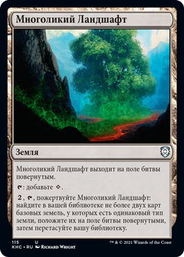 | Rules | Myriad Landscape enters the battlefield tapped. : Add . , , Sacrifice Myriad Landscape: Search your library for up to two basic land cards that share a land type, put them onto the battlefield tapped, then shuffle. |
