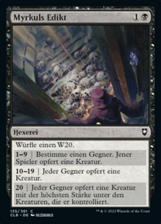| Rules | Roll a d20. 1-9 | Choose an opponent. That player sacrifices a creature. 10-19 | Each opponent sacrifices a creature. 20 | Each opponent sacrifices a creature with the greatest power among creatures that player controls. |