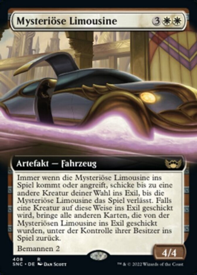 | Rules | Whenever Mysterious Limousine enters the battlefield or attacks, exile up to one other target creature until Mysterious Limousine leaves the battlefield. If a creature is put into exile this way, return each other card exiled with Mysterious Limousine to the battlefield under its owner's control. Crew 2 |