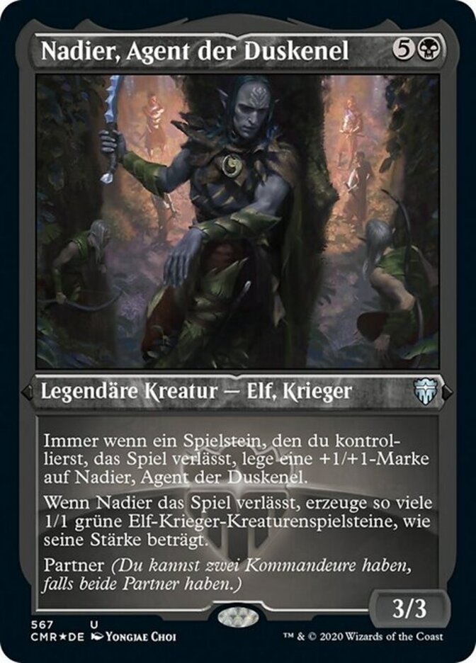 | Rules | Whenever a token you control leaves the battlefield, put a +1/+1 counter on Nadier, Agent of the Duskenel. When Nadier leaves the battlefield, create a number of 1/1 green Elf Warrior creature tokens equal to its power. Partner (You can have two commanders if both have partner.) |