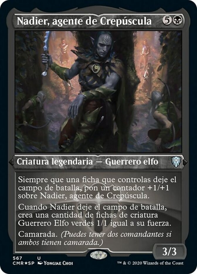 | Rules | Whenever a token you control leaves the battlefield, put a +1/+1 counter on Nadier, Agent of the Duskenel. When Nadier leaves the battlefield, create a number of 1/1 green Elf Warrior creature tokens equal to its power. Partner (You can have two commanders if both have partner.) |