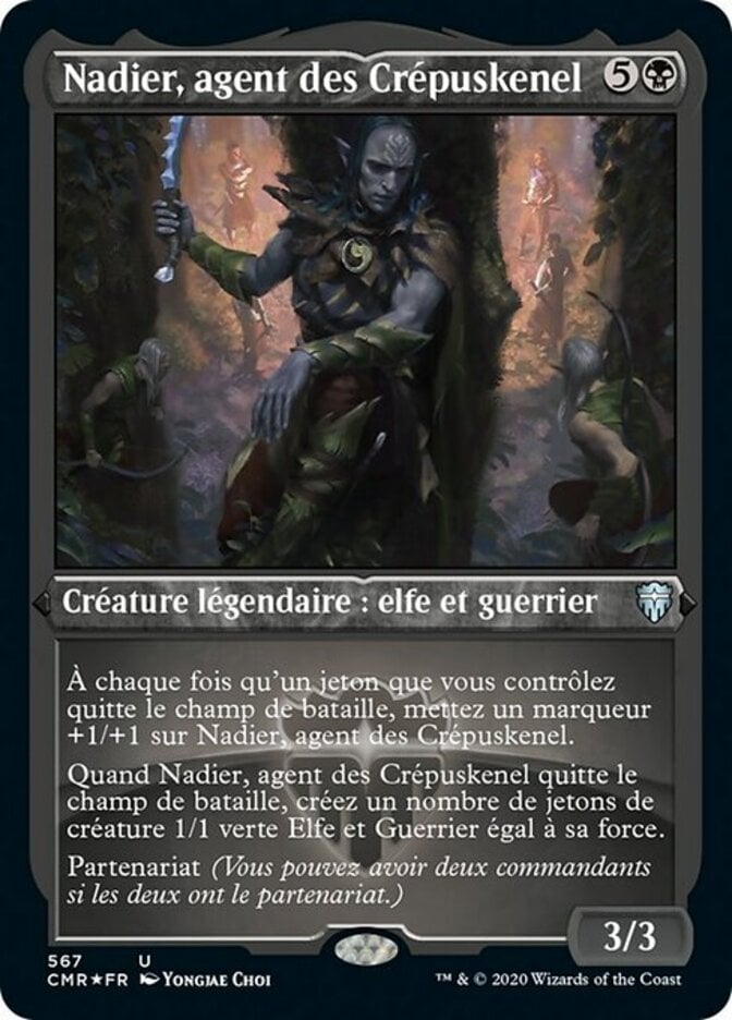 | Rules | Whenever a token you control leaves the battlefield, put a +1/+1 counter on Nadier, Agent of the Duskenel. When Nadier leaves the battlefield, create a number of 1/1 green Elf Warrior creature tokens equal to its power. Partner (You can have two commanders if both have partner.) |