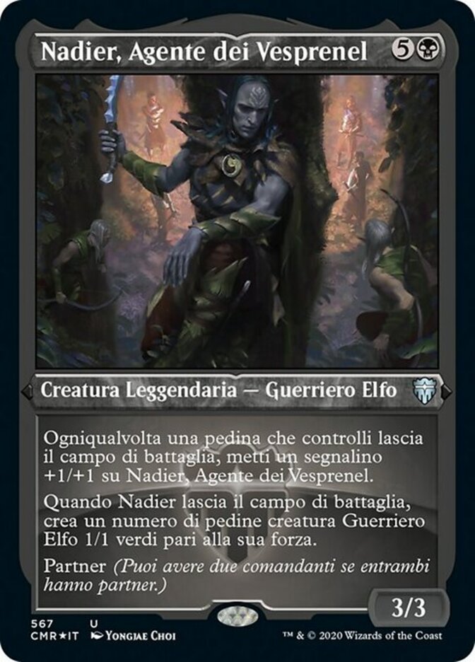 | Rules | Whenever a token you control leaves the battlefield, put a +1/+1 counter on Nadier, Agent of the Duskenel. When Nadier leaves the battlefield, create a number of 1/1 green Elf Warrior creature tokens equal to its power. Partner (You can have two commanders if both have partner.) |