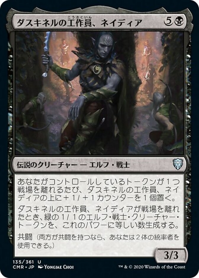 | Rules | Whenever a token you control leaves the battlefield, put a +1/+1 counter on Nadier, Agent of the Duskenel. When Nadier leaves the battlefield, create a number of 1/1 green Elf Warrior creature tokens equal to its power. Partner (You can have two commanders if both have partner.) |