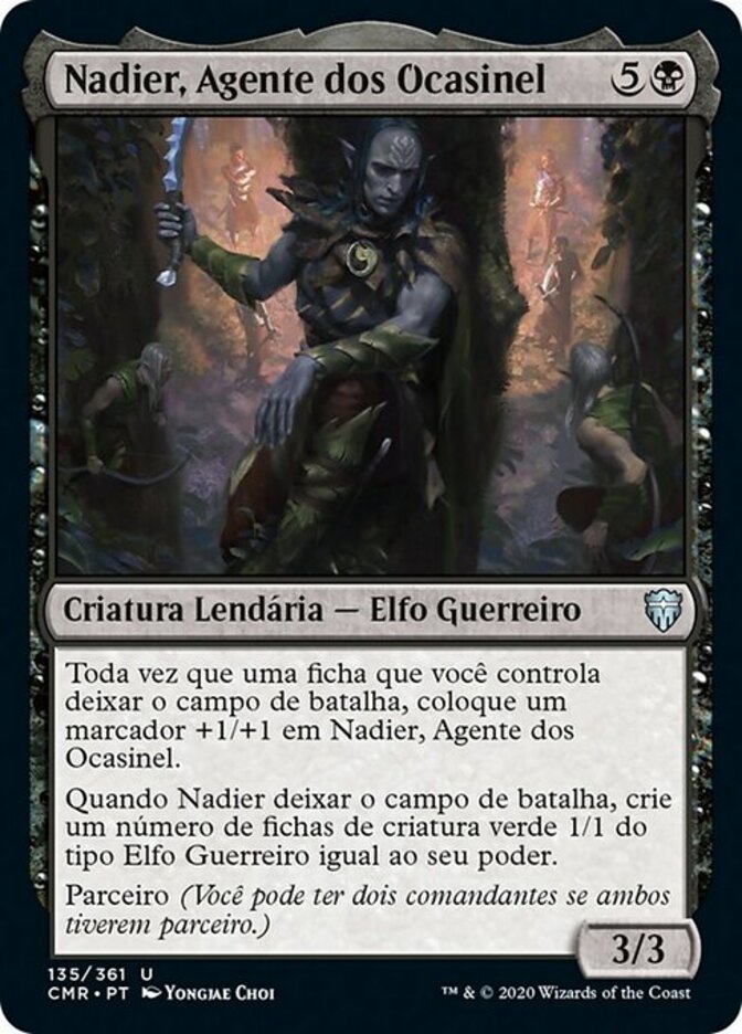 | Rules | Whenever a token you control leaves the battlefield, put a +1/+1 counter on Nadier, Agent of the Duskenel. When Nadier leaves the battlefield, create a number of 1/1 green Elf Warrior creature tokens equal to its power. Partner (You can have two commanders if both have partner.) |