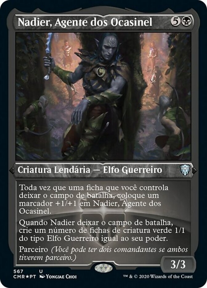 | Rules | Whenever a token you control leaves the battlefield, put a +1/+1 counter on Nadier, Agent of the Duskenel. When Nadier leaves the battlefield, create a number of 1/1 green Elf Warrior creature tokens equal to its power. Partner (You can have two commanders if both have partner.) |
