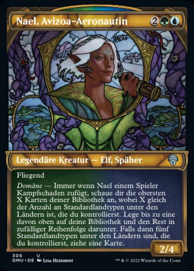 | Rules | Flying Domain — Whenever Nael, Avizoa Aeronaut deals combat damage to a player, look at the top X cards of your library, where X is the number of basic land types among lands you control. Put up to one of them on top of your library and the rest on the bottom in a random order. Then if there are five basic land types among lands you control, draw a card. |