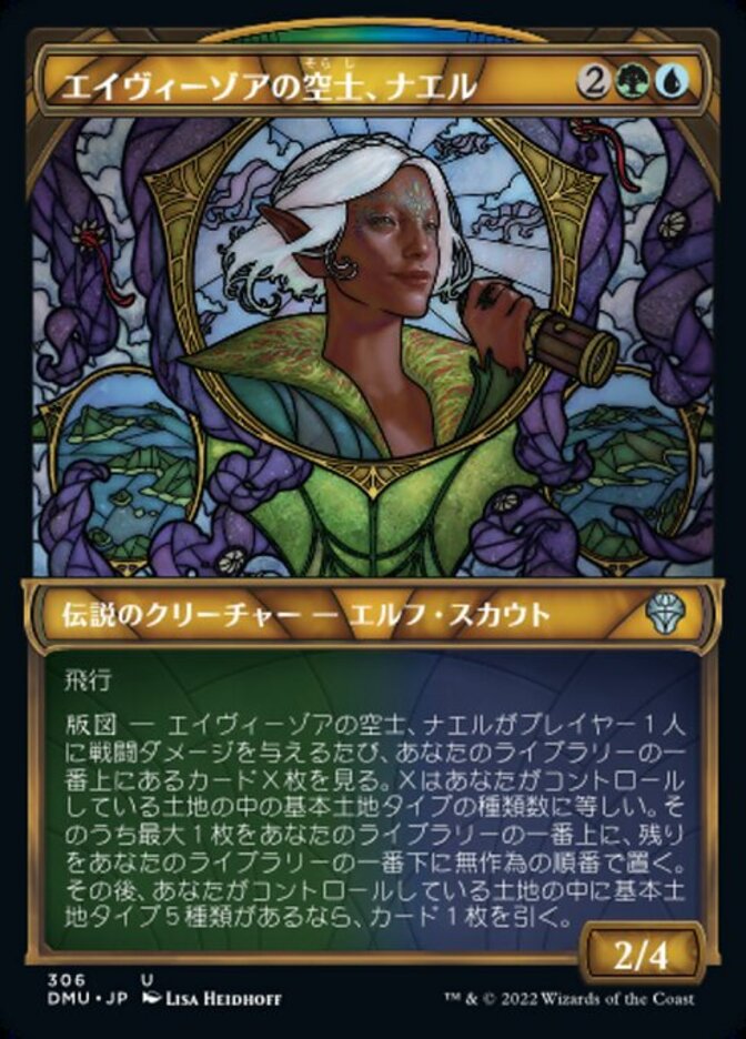 Domain — Whenever Nael, Avizoa Aeronaut deals combat damage to a player, look at the top X cards of your library, where X is the number of basic land types among lands you control. Put up to one of them on top of your library and the rest on the bottom in a random order. Then if there are five basic land types among lands you control, draw a card.