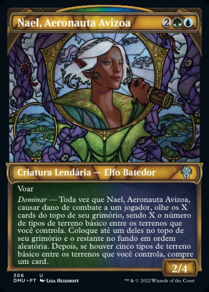 | Rules | Flying Domain — Whenever Nael, Avizoa Aeronaut deals combat damage to a player, look at the top X cards of your library, where X is the number of basic land types among lands you control. Put up to one of them on top of your library and the rest on the bottom in a random order. Then if there are five basic land types among lands you control, draw a card. |