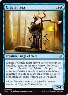 | Rules | When Naga Oracle enters the battlefield, look at the top three cards of your library. Put any number of them into your graveyard and the rest back on top of your library in any order. |