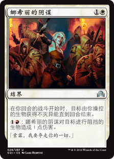 | Rules | At the beginning of combat on your turn, target creature you control gains indestructible until end of turn. : Nahiri's Machinations deals 1 damage to target blocking creature. |