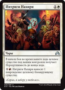 | Rules | At the beginning of combat on your turn, target creature you control gains indestructible until end of turn. : Nahiri's Machinations deals 1 damage to target blocking creature. |