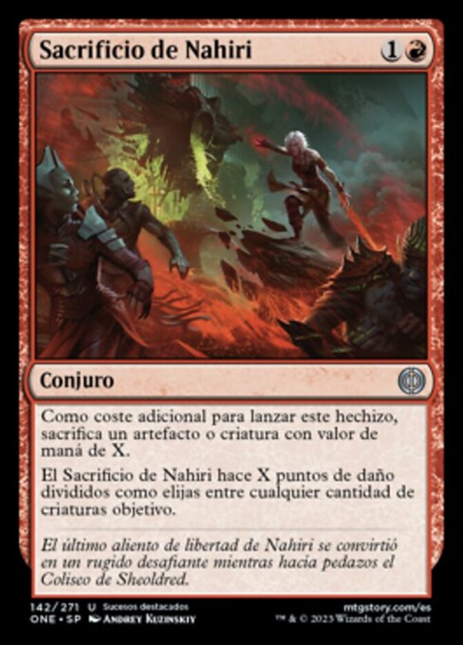 | Rules | As an additional cost to cast this spell, sacrifice an artifact or creature with mana value X. Nahiri's Sacrifice deals X damage divided as you choose among any number of target creatures. |