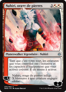 | Rules | As long as it's your turn, creatures you control have first strike and equip abilities you activate cost less to activate. −X: Nahiri, Storm of Stone deals X damage to target tapped creature. |