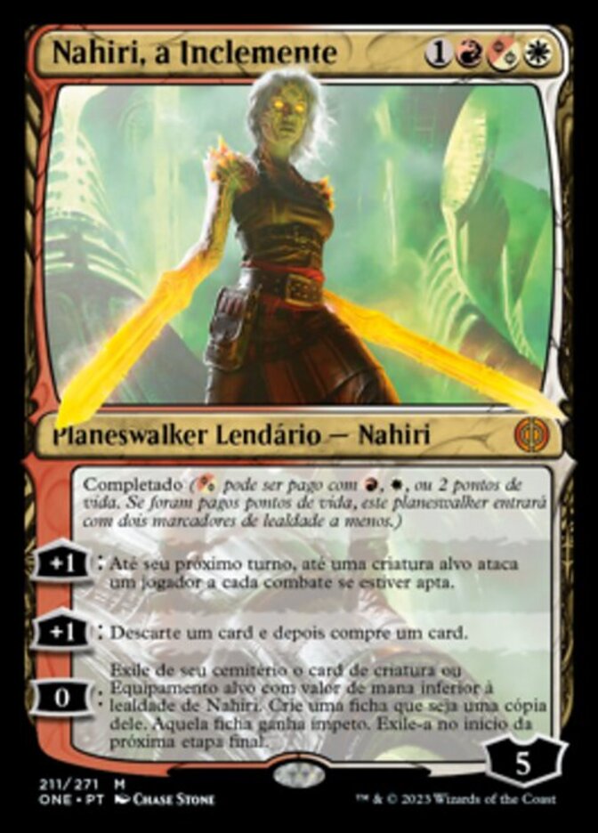 | Rules | Compleated ( can be paid with , , or 2 life. If life was paid, this planeswalker enters with two fewer loyalty counters.) +1: Until your next turn, up to one target creature attacks a player each combat if able. +1: Discard a card, then draw a card. 0: Exile target creature or Equipment card with mana value less than Nahiri's loyalty from your graveyard. Create a token that's a copy of it. That token gains haste. Exile it at the beginning of the next end step. |