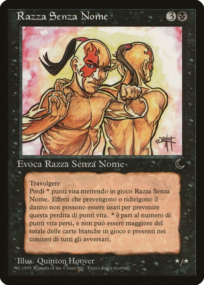 | Rules | Trample As Nameless Race enters the battlefield, pay any amount of life. The amount you pay can't be more than the total number of white nontoken permanents your opponents control plus the total number of white cards in their graveyards. Nameless Race's power and toughness are each equal to the life paid as it entered the battlefield. |