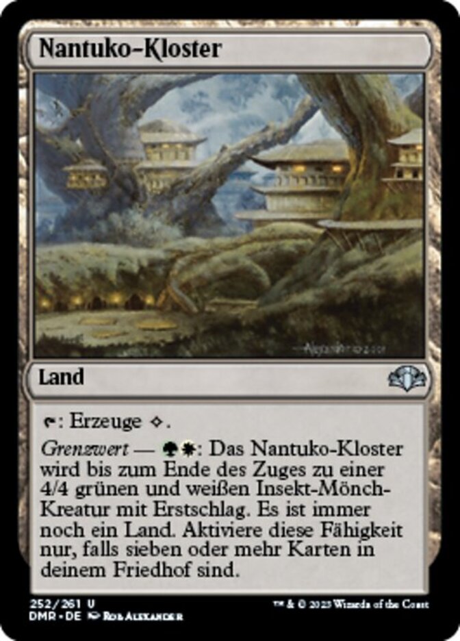 | Rules | : Add . Threshold — : Nantuko Monastery becomes a 4/4 green and white Insect Monk creature with first strike until end of turn. It's still a land. Activate only if seven or more cards are in your graveyard. |