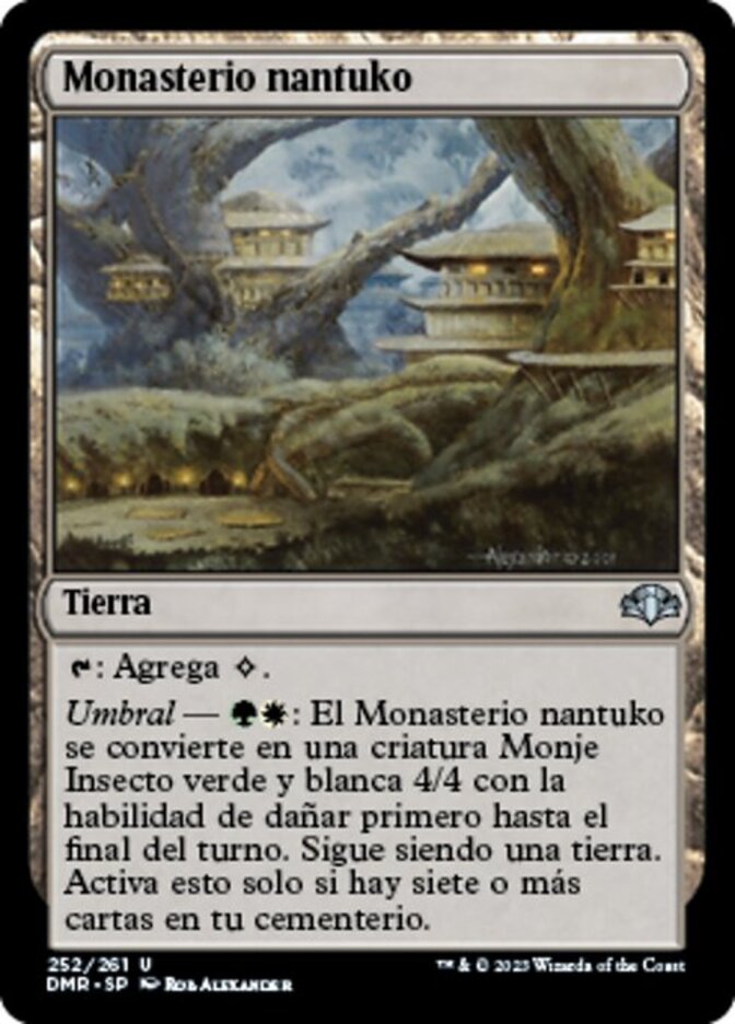 | Rules | : Add . Threshold — : Nantuko Monastery becomes a 4/4 green and white Insect Monk creature with first strike until end of turn. It's still a land. Activate only if seven or more cards are in your graveyard. |