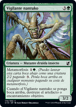 | Rules | Morph (You may cast this card face down as a 2/2 creature for . Turn it face up any time for its morph cost.) When Nantuko Vigilante is turned face up, destroy target artifact or enchantment. |
