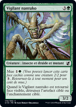 | Rules | Morph (You may cast this card face down as a 2/2 creature for . Turn it face up any time for its morph cost.) When Nantuko Vigilante is turned face up, destroy target artifact or enchantment. |