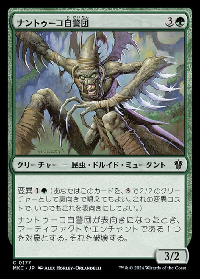 | Rules | Morph (You may cast this card face down as a 2/2 creature for . Turn it face up any time for its morph cost.) When Nantuko Vigilante is turned face up, destroy target artifact or enchantment. |