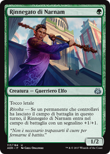 | Rules | Deathtouch Revolt — Narnam Renegade enters the battlefield with a +1/+1 counter on it if a permanent you controlled left the battlefield this turn. |
