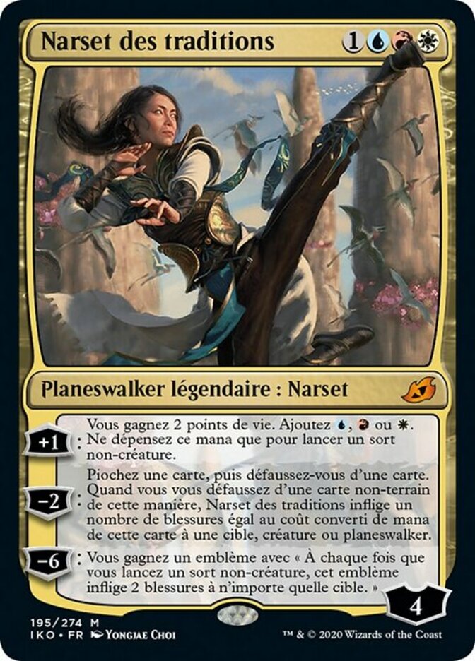 | Rules | +1: You gain 2 life. Add , , or . Spend this mana only to cast a noncreature spell. −2: Draw a card, then you may discard a card. When you discard a nonland card this way, Narset of the Ancient Way deals damage equal to that card's mana value to target creature or planeswalker. −6: You get an emblem with "Whenever you cast a noncreature spell, this emblem deals 2 damage to any target." |