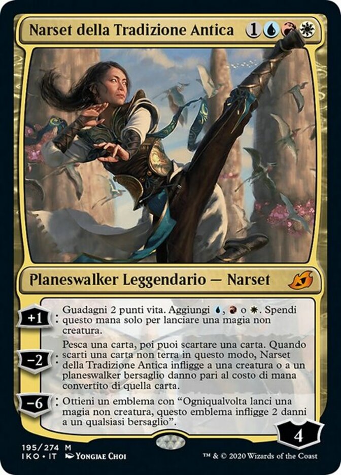 | Rules | +1: You gain 2 life. Add , , or . Spend this mana only to cast a noncreature spell. −2: Draw a card, then you may discard a card. When you discard a nonland card this way, Narset of the Ancient Way deals damage equal to that card's mana value to target creature or planeswalker. −6: You get an emblem with "Whenever you cast a noncreature spell, this emblem deals 2 damage to any target." |