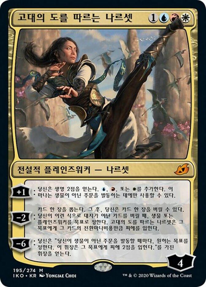 | Rules | +1: You gain 2 life. Add , , or . Spend this mana only to cast a noncreature spell. −2: Draw a card, then you may discard a card. When you discard a nonland card this way, Narset of the Ancient Way deals damage equal to that card's mana value to target creature or planeswalker. −6: You get an emblem with "Whenever you cast a noncreature spell, this emblem deals 2 damage to any target." |